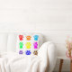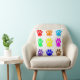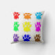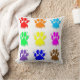 Decorative pillow. A colourful pattern of dog paw prints with ink splatter effect. Design in red, orange, light blue, green, yellow, pink, purple dark blue and brown.