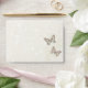 Pretty inked art butterflies on a cream and pink damask swirl. Add your address on the reverse to prevent lost of invitations in the post. Art and design by Sarah Trett.