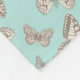 A pretty inked swallowtail, painted lady and fritary butterfly patterned aqua, blue, green and cream blanket. Personalise with your own name and initial currently reads Eliza B. Designed by Sarah Trett.