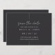 Designed to coordinate with our Inline wedding collection, this beautiful save the date card features your wedding details, including date, location, and website, in white lettering on a soft ash black background accented with handwritten script and delicate vertical line detailing.