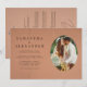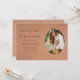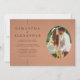 Choose this unique minimalist wedding invitation template featuring a sleek, classic lettering and one of your favourite engagement photos in an oval frame on a delicate, light terracotta floral background.