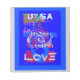 White: Employed for the "USA" and "LOVE" text, offering a strong contrast against the blue background, ensuring the words stand out prominently.