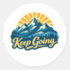An inspiring poster of a majestic mountain range with a bright sun and the phrase "Keep Going." A flat Victorian design in blue and gold, it reminds you to keep going on your journey.