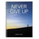 Inspirational Message Never Give Up Journal designed on a blue and black background with the image of a person climbing a steep hill. The text also includes your Name or Initials. To personalize, simply insert your preferred text using our easy template, replacing the sample text. Makes a great gift.