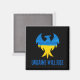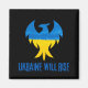 An inspirational magnet design that echoes the resilience of the Ukrainian people, features a phoenix bird silhouette in the blue and yellow colours of Ukraine's flag with "Ukraine will rise" text in distressed font on black background