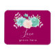 A magnet with some inspirational words: Love grows here. Written on a magenta background. A pastel watercolor flower bouquet at the top. The flowers, leaves and sprigs are pastel pink and green. Created with watercolor paint and digitised. Beautiful and uplifting.