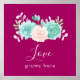 A poster with some inspirational words: Love grows here. Written on a magenta background. A pastel watercolor flower bouquet at the top. The flowers, leaves and sprigs are pastel pink and green. Created with watercolor paint and digitised. Beautiful and uplifting.