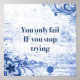 You Only Fail If You Stop Trying inspirational saying poster. Inspiring motivation to keep a positive attitude and reach your goals. With a faded painted wood effect background with swirls and retro look flowers. Dark blue letters typography text. Display somewhere handy as a daily reminder. Nice gift for teens or anyone facing a challenge, such as weight loss or getting fit. Great for classrooms, too. This motivational design is available on other products in our online angela65 Zazzle shop. Display to motivate and inspire. This positive attitude design is available on other products in our Zazzle angela65 store. Other words of wisdom designs are also available.