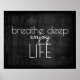This inspirational quote poster has typography white text with breathe deep enjoy life on dark charcoal grey distressed background for wall art decor in home or office.