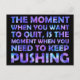 The moment when you want to quit, is the moment when you need to keep pushing, inspirational text saying quote design with a purple, pink and blue watercolor space galaxy inspired overlay.
