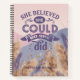 Modern boho chic design with watercolor pampas grass on the background of a landscape sunset with sky and mountains in pastel colours of blush pink and blue with women empowering inspirational quote "She believed she could, so she did".