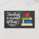 This chalkboard style business card features a watercolor red apple on books. The back of the card has the inspirational quote "teaching is a work of heart" in an elegant script calligraphy style. Personalise the card with the teacher's or librarian's name, title, phone number, and email.