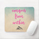 Mousepad with a motivating strength-inspired quotation on determination. Designed to uplift and encourage which says: "conquer from within". Written in a girly hot pink. A black sketch of a mountain top illustrated below the quotation to signify the journey, the struggle and the ultimate accomplishment of achieving ones personal triumphs.