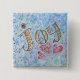 The golden yellow word "Joy" sparkles outlined in silver glitter. Below "Joy" are three pink hearts with a purple outline. The background contains soft blue, green, and lavendar tones. The painting was rendered in watercolor. Glass glitter sprinkled on top to add to the happy feeling of joy from the inspirational word painting.