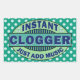 "Instant Clogger: Just Add Music." This cute rectangular sticker design for clog dancers features an oval-shaped banner in shades of blue, green and white with music notes and stripes. The background is blue-green with white polka dots. It's a pretty sticker for the clog dancing fan. See variations and more original clogging designs at our ClogDance shop link!