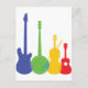 A group of silhouetted and colourful stringed instruments including an electric guitar, a banjo, a violin and a ukulele