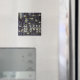 A fridge magnet that features a printed circuit board complete with labelled electronic components: resistors, capacitors, transistors. An aesthetic arrangement with contrasting colours of a black circuit board and components in shades of silver labelled in yellow.
