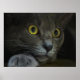 A close-up shot of the face of a grey cat with yellow eyes and dilated pupils, resting his head on his paw and staring intently at something behind the camera.