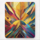 A vibrant array of bold, geometric shapes converges at the centre, forming a symmetrical and colourful composition. The piece uses a variety of hues, ranging from warm yellows and oranges to cool blues and purples.