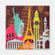 This design features a travel composition of principal landmarks around the world.