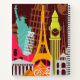 This design features a travel composition of principal landmarks around the world.