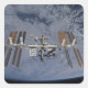 International Space Station set against the background of a cloud covered Earth featured with Terra.