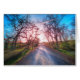 Moving fast towards the light down a country road. Trees blurred from acceleration.