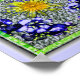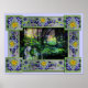 A beautiful green woodland on a sunny early summer or late spring day. A forest road with shinning puddles lead into the light. Pastel, photography, digital art. The floral (dandelion and bluebell) & grey denim border has a bit of the "Arts and Crafts style" feel.