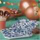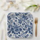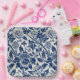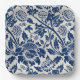 Intricate blue floral pattern on a light background, featuring stylized blooms and curling leaves, evoking a vintage, elegant feel.
