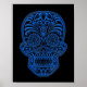 This elaborate Day of the Dead sugar skull design is decorated with intricate swirls and dot patterns. The complex lines and circles are highlighted to create a subtle shine on the surface. The eyes of the skull are represented by large stylised flowers with pedals that stretch out from a central circle. This stylish design is a striking representation of this symbol from the Day of the Dead.