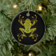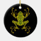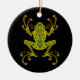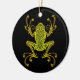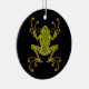 This tribal tree frog is decorated with intricate yellow swirls and dot patterns. The interior of the frog is painted a deep green color and it sits on a pure black background. This stylish ornament is a striking representation of this wonderful little creature.