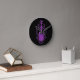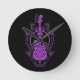 Intricate Purple Bass Guitar Design on Black Round Clock