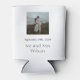 Against a clean white background, the can cooler features refined black script typography that exudes elegance and charm. The minimalist design ensures that the focus remains on the couple, as their photos grace the surface of the cooler. Multiple images capture various moments of the couple's journey together, from intimate snapshots to candid embraces, creating a comprehensive visual narrative of their love story.
