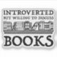 Introverted But Willing To Discuss Books. Funny book lover design is a great gift for someone who loves books, reading, libraries, book shops and book stores. Perfect for a librarian, book nerd or bibliophile. Are you a bookaholic and an introvert? Do you love to read literature and novels in a library or a used book store? Are you an insatiable reader? If you're a geek about books, this funny book quote design is for you!