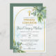 Invite a tus seres queridos a la Primera Comunión de tu hijo con esta invitación. Adornada con hojas verdes de acuarela y una cruz dorada, este diseño es lindo y elegante. Ideal para una ceremonia católica religiosa, esta invitación con follaje añade un toque de belleza a tu día especial.