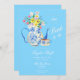This invitation featuring floral blue and white tea pot with bright colourful flowers is perfect for the most lovely bridal shower.