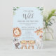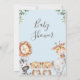 Safari themed baby shower invitation for twin boys featuring six cute jungle animals and some foliage on a blue background.