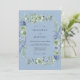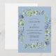 This design features a tranquil colour palette of soft cornflower blue and sage green, creating a romantic and airy atmosphere. Delicate watercolor roses and lush hydrangeas are artfully arranged throughout the composition, complemented by dainty leaves and sprigs. The painterly textures and muted tones evoke a sense of timeless elegance for a botanical event.