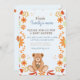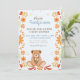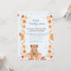This baby shower invitation from the "Bundle of Joy Essentials" collection features a delightful autumn-inspired design. At its centre, a loveable teddy bear holds a bouquet, surrounded by a vibrant floral border in warm hues of orange, yellow, and red. The design combines charm and elegance, offering space to personalise key event details such as the date, time, location, and RSVP. Ideal for celebrating the arrival of a new baby, this invitation brings warmth and joy to your special gathering.