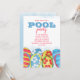 This design features modern simple watercolor pool party, minimalist whimsical summer swimming, tropical beach Splish splash, beach Hawaiian luau flip flops, stylish trendy calligraphy script, waterslide fun celebration outdoor, great for girl boy birthday rustic funny, bold typography BBQ backyard, cute red, blue, yellow, cocktail adult kids teen tween