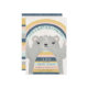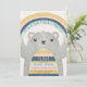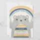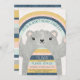 This cute birthday party invitation features a sweet grey bear with a rainbow striped tummy holding up a rainbow with the same colours. Colours include grey, navy, mustard, light green, and peach.