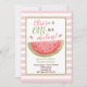 One in a melon birthday invitation for a watermelon first birthday party! Includes a sweet pink and green watercolor watermelon illustration. © 2021 Tea Olive Co.