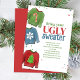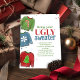 This design features a Christmas party invitation, with a funny ugly sweater, cute watercolor design, a festive fun unique style with red green, and blue, modern typography, holiday party, classic parties, whimsical, great for business or corporate parties too,