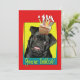 Invite your guests with this whimsical Pug Dog Greeting Card. With a cupcake balanced on it's head, this design is sure to bring a smile and giggles! BTW, This design has several versions, with different background colours. There is also a Happy Birthday version.