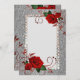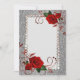 This invitation created on quality stock has faux silver glitter print on front with faux rhinestone-look border and red roses with red scrolls embellishment print. Plenty of space for you to custom add your text. Backside has faux silver glitter background with same large red roses scroll print at the top with room to add your personalised information. Customise or buy as shown for a handwritten touch.