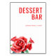 This wedding tabletop sign features a clean, minimalist design with a white background and bold red typography that reads "DESSERT BAR" followed by "please take a treat!" in a lighter shade of red. The modern sans-serif font adds a contemporary touch, while the illustration of three vibrant red roses with green leaves in the bottom left corner brings a classic charm to the layout. The striking color palette of reds and greens creates an inviting and cheerful atmosphere, making it perfect for encouraging guests to indulge in sweet treats at your event.