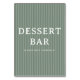 This wedding tabletop sign features a minimalist design with vertical stripes in muted green tones, creating a subtle yet elegant backdrop. The clean, modern typography prominently displays "DESSERT BAR" in bold uppercase letters, followed by the inviting phrase "PLEASE HELP YOURSELF!" in a lighter weight font. The overall style is contemporary and approachable, perfect for setting a relaxed and friendly atmosphere at your event. Its simple composition and effective use of negative space ensure clear communication while maintaining visual appeal.