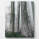 Fog descends into a forest. Three trees are grouped together among some ferns.