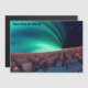An aurora, green due to ionised oxygen, appears low on the horizon, a city sits in the foreground. Add your own text.