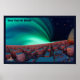 An aurora, green due to ionised oxygen, appears low on the horizon, a city sits in the foreground. Add your own text.